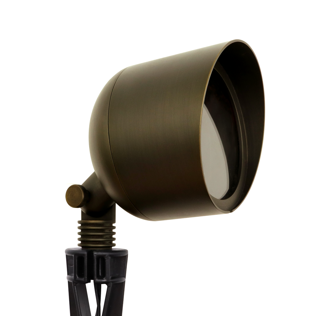 The Irradiar Landscape Spotlights deliver precise, powerful illumination with a durable 2.4” die-cast brass construction available in Antique Brass or Black finish. Designed for versatility, they feature an adjustable hood for beam control, vertical angle positioning, and a flat clear glass lens for optimal clarity. Compatible with MR16 lamps (not included) and offering 15°/30°/45°/60°/100° beam options, these spotlights are ideal for accentuating architectural elements, pathways, and trees. Complete with a ground stake for easy installation, they provide a stylish and adaptable lighting solution for any outdoor setting.